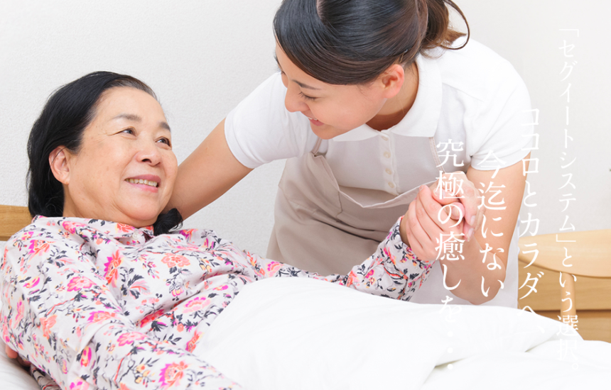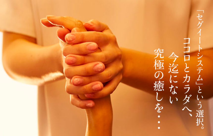 人には生来備わった「自然治癒力」というものがあります。しかし、どんなにバランスのとれた生活をしていたとしても、”身体”がこの地球上にある以上、ストレス・電磁波・そして加齢というものは避けることができません。これらの要因によって身体の細胞ひとつひとつを動かす源である生体電流が乱され、自然治癒力の低下や身体の不調を引き起こすと考えられます。 実用新案を取得した「セグイートシステム」は出力された低周波を、特殊マットにより「テラヘルツ波」と呼ばれる毎秒1兆回の振動をしている透過浸透型波長に変換し、施術者の手に伝わり触れたところに届きます。このテラヘルツ波が「細胞内水分」や「DNA」「たんぱく質」「体内酵素」など生体高分子に正常な共鳴振動を与え、新陳代謝、免疫細胞の活性化、アンチエイジング効果が期待できます。このことからテラヘルツ波は最大の「美容・健康波長」と言われています。 セグイートシステムは施術される側は勿論のこと、施術する側のセラピストやヘルパーさんにも良い影響をおよぼしますので、このシステムを一人でも多くの方にご使用いただきたい、と考えております。